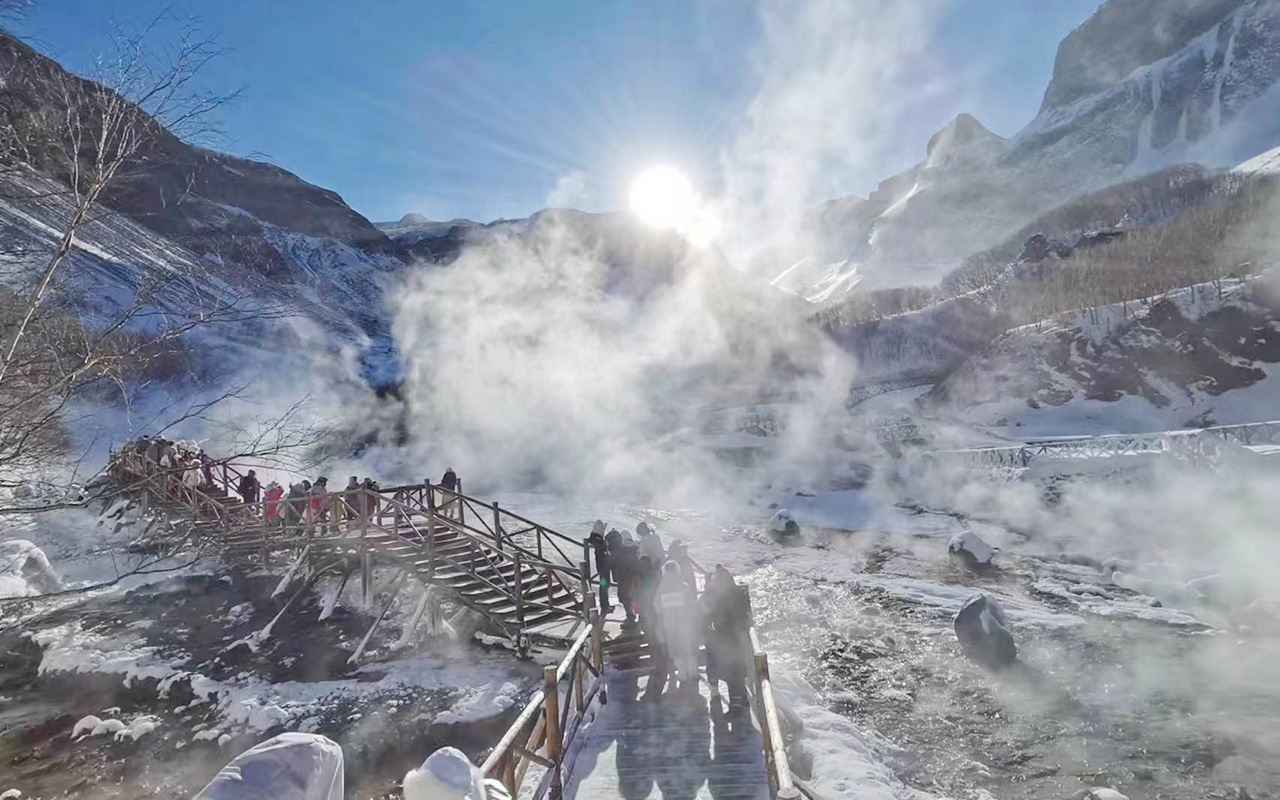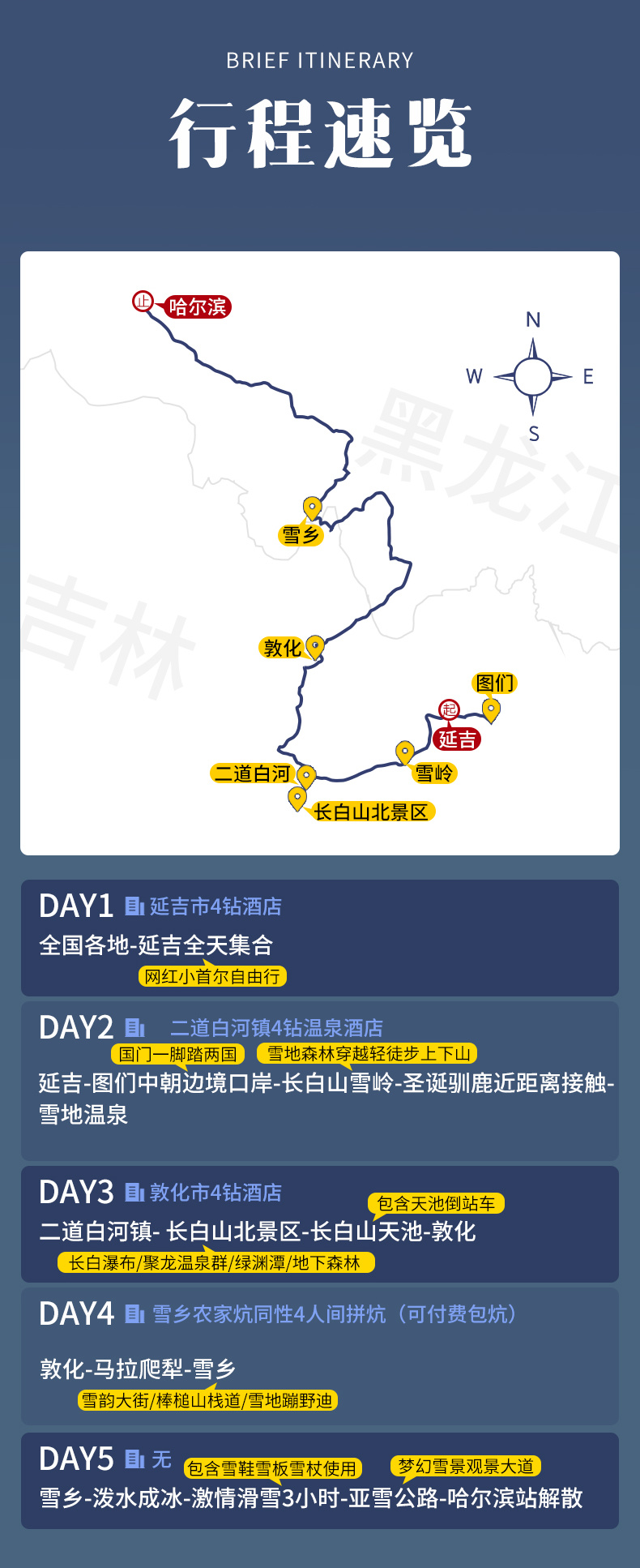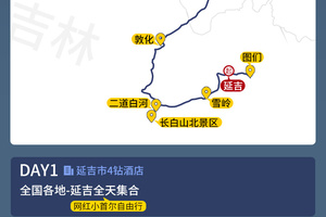 延吉-(50km,约1小时)图们中朝边境口岸-国门一脚踏两国-(180km,约3小时)长白山雪岭-森林雪山轻徒步-圣诞驯鹿接触-(65km,约1.5小时)雪地温泉
