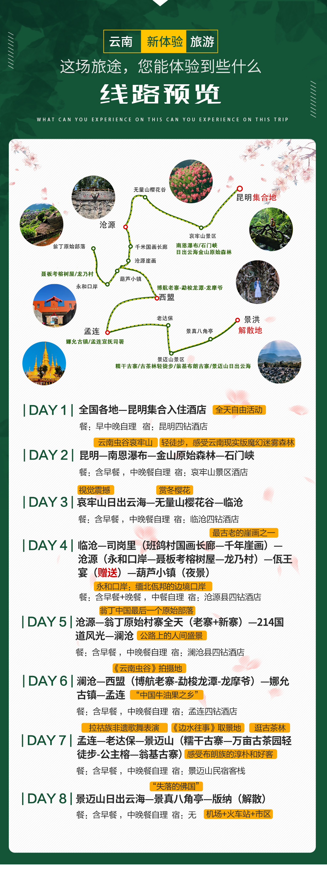 之后前往景洪(西双版纳),结束愉快的8天7晚深度游之旅。为方便大家回程,特别设置3个解散点