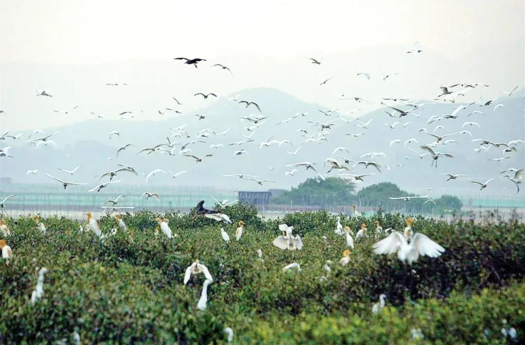 红树林成百上千的白鹭鸟在红树林里面徘徊打转,也有“安分”的白鹭鸟在枝头上栖息,随手一拍都是“落下与孤鹜齐飞,秋水共长天一色”的视觉美感。