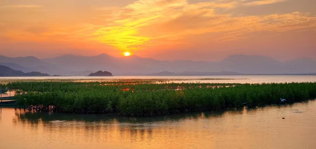 这里有大片的海滩红树林,可以乘小船探秘红树林,傍晚来这里可以看到大群的白鹭归巢,等退潮时可以欣赏到七彩的滩涂,随手一拍一幅绝美的日落大片就有了。