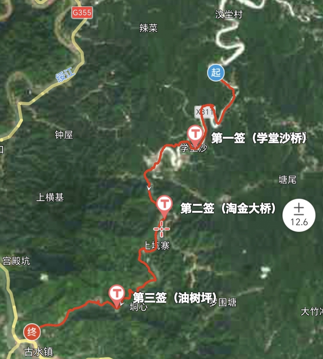 (起点)竹黎—凤坪—滑琴—学堂沙(5KM,第一签)—不六—淘金(10KM,第二签)—上坑寨—罗秀—油树坪(15KM,第三签)—石蛤—城田—古水河郊野径标识点(终点)
