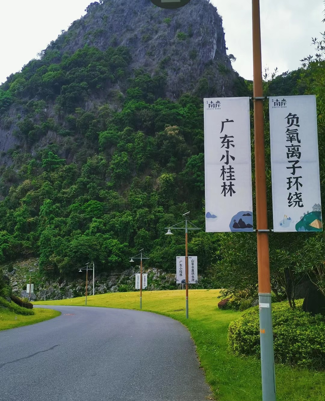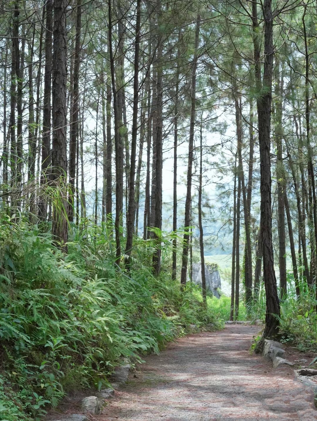 从同心岛穿过英石阵,直接由步道通往郊野公园,公园区域植被覆盖率达95%以上,原始森林资源均保护完好,1条松林泥道穿过公园。