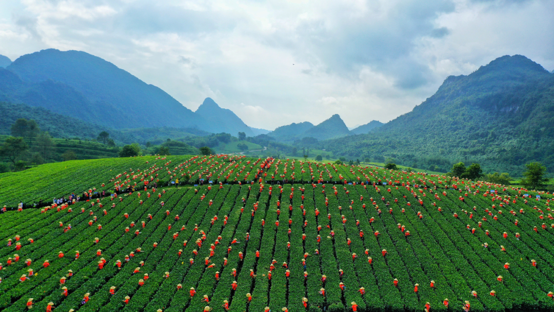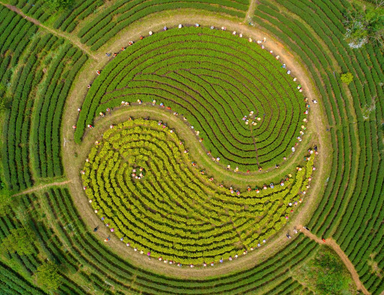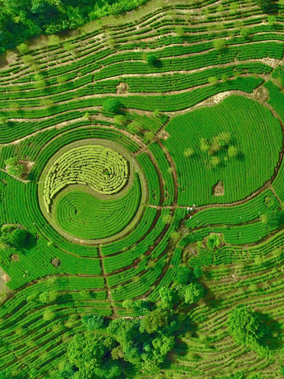 八卦山上种了两种不同品种的茶树,有的茶树叶片深绿,有的茶树叶片金黄油润,航拍镜头下,可以看到一个明显的八卦图。
