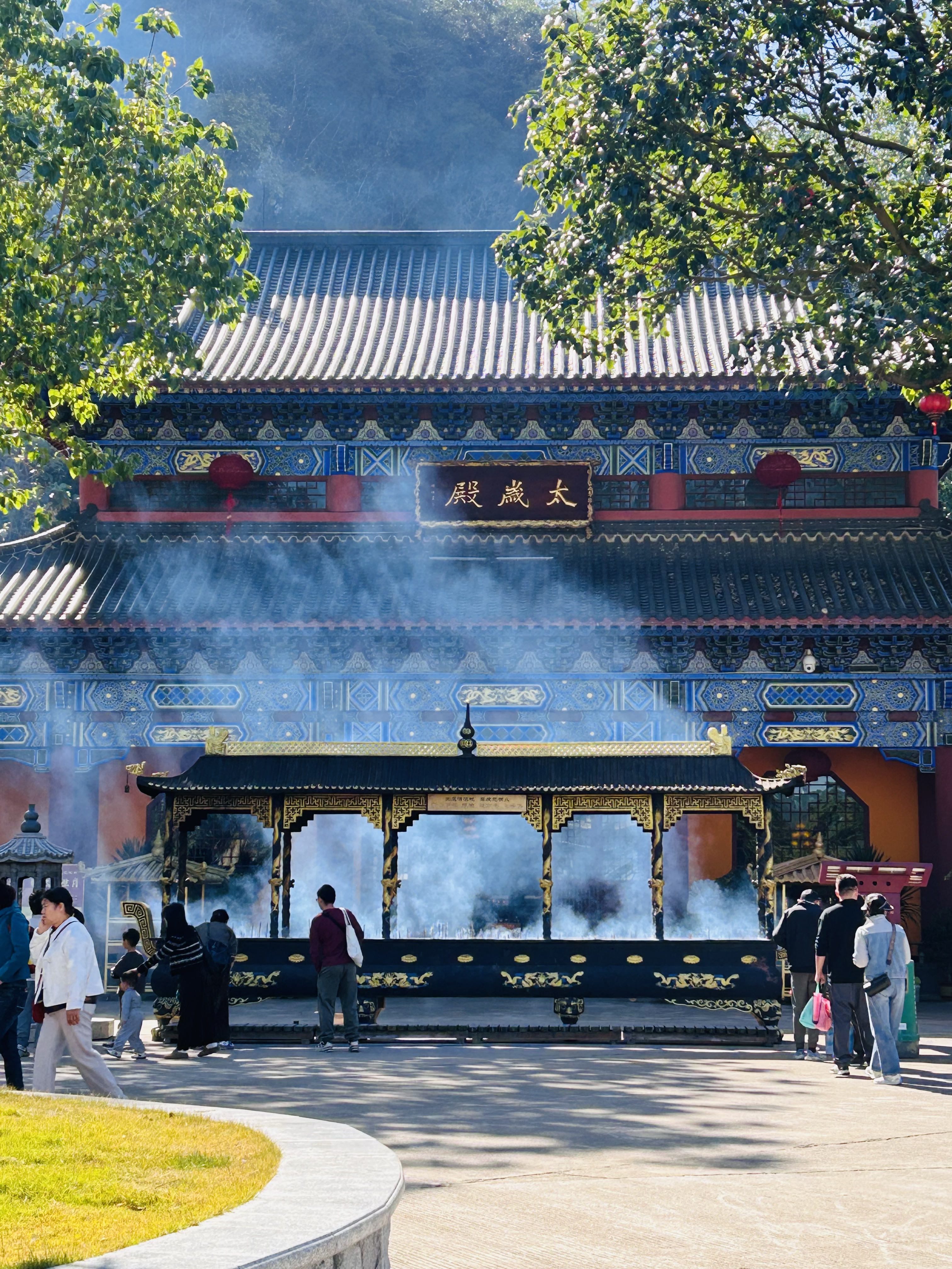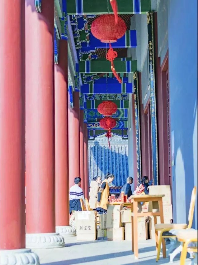 红漆白瓦,青蓝底纹。大雄宝殿,气势非凡