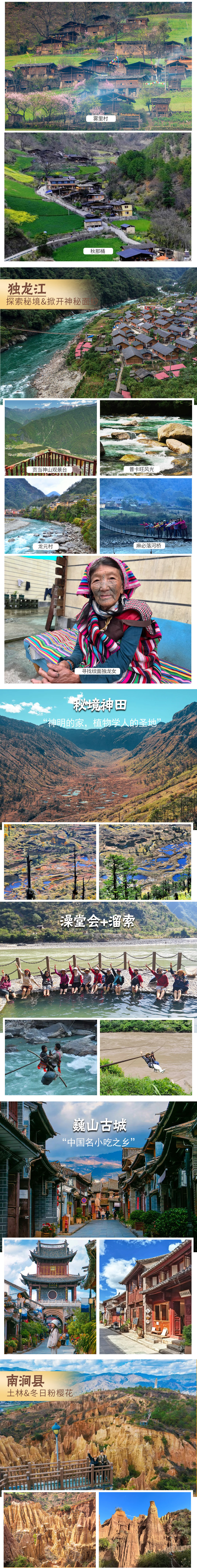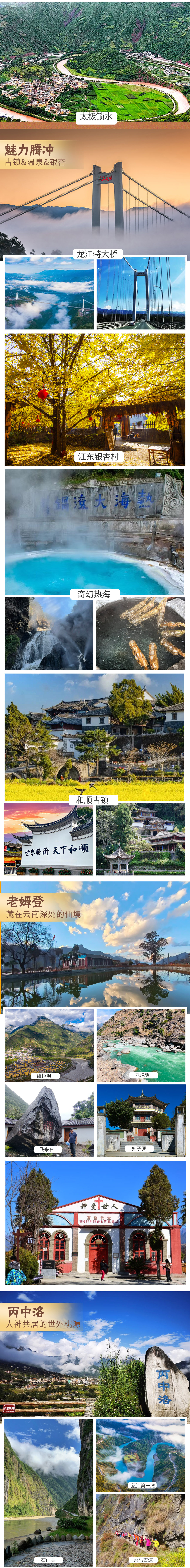 2、【景点】:诺邓古村、太极锁水、银杏村门票+单程电瓶车、热海景区门票、和顺古镇门票套票、柏联温泉(赠送)、老姆登、怒江大峡谷、丙中洛、秋那桶、雾里村,滇藏界碑、秘境独龙江、纹面女、巍山古城、南涧土林、无量山樱花谷门票。