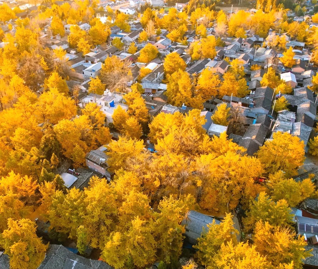 早起晨拍银杏村。 【晨曦中的银杏村】早晨,阳光透过树叶缝隙投下美丽的斑驳光影,整个村庄都掩映在一片金黄中。微风吹过,黄叶在空中翻滚飘舞,随后又厚厚铺满房顶、屋头、小巷、田埂,钻进石头缝隙,落入房檐深处……顺着村间小路绕行,一棵棵古银杏树像优雅的舞者一般,在风中摇曳,婀娜多姿。千百年来,村子里的居民就生活在这金黄色的的秘境里,过着温馨、和谐的日子……