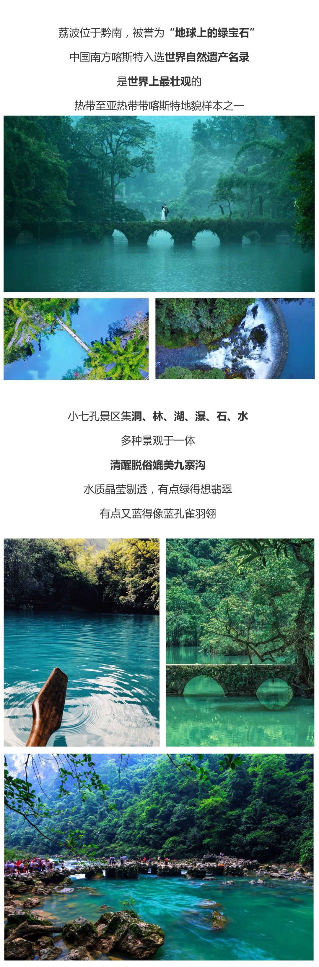 早餐后,我们出发前往【荔波小七孔】,荔波位于贵州与广西的交界处,小七孔更是被称为地球上的绿宝石,我们从东门进入小七孔景区,穿过清朝时期修建的小七孔桥,步行于这“抬头张家界,低头九寨沟”的自然风光,步行于走道上,水花溅落在四周,感受【68级跌水瀑布】和【拉雅瀑布】的壮观,我们戏水踏步于“水上有石,石上有树,树植水中”的【水上森林】,归隐于卧龙潭瀑布。在天然的喀斯特高原湖上,尽情的用充足的时间深度这里的山水美景。结束后乘车去荔波县入住,约半小时抵达荔波县。大家会感受荔波美食街的热闹景象,好好的满足一顿晚餐的欢乐时光。