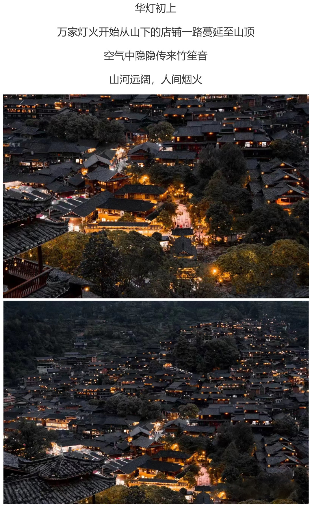 晚上华灯初上,像满天星星洒落在山头。我们相约品尝独具特色的苗家长桌宴,听着芦笙和苗歌,好好感受这醉美西江夜色吧。