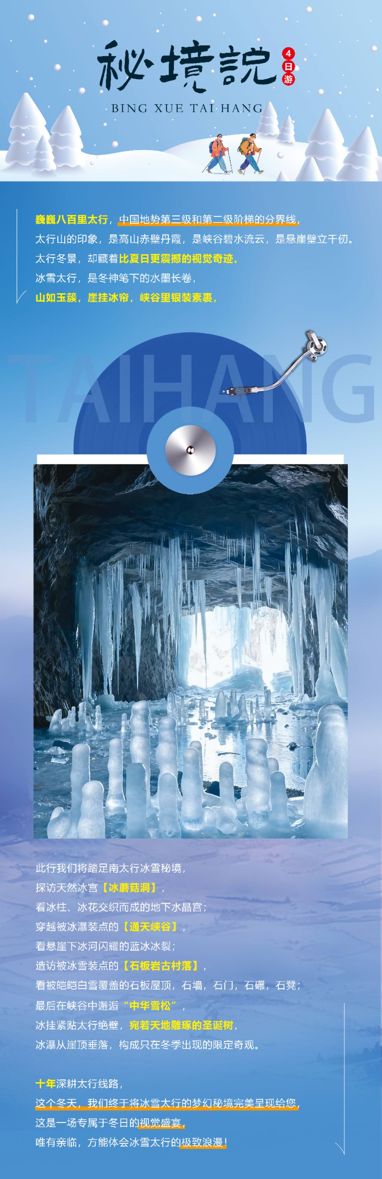 我们踏雪徒步,穿越银装素裹的太行峡谷,最终抵达这片冰雪秘境。踏入洞中,仿佛步入一个凝固的水晶宫殿。洞内核心奇观“冰蘑菇群”,形态各异。巨大的岩石基座被层层叠叠的纯净冰层包裹,形似一朵朵破雪而出的白色蘑菇,形态憨掬可掬。