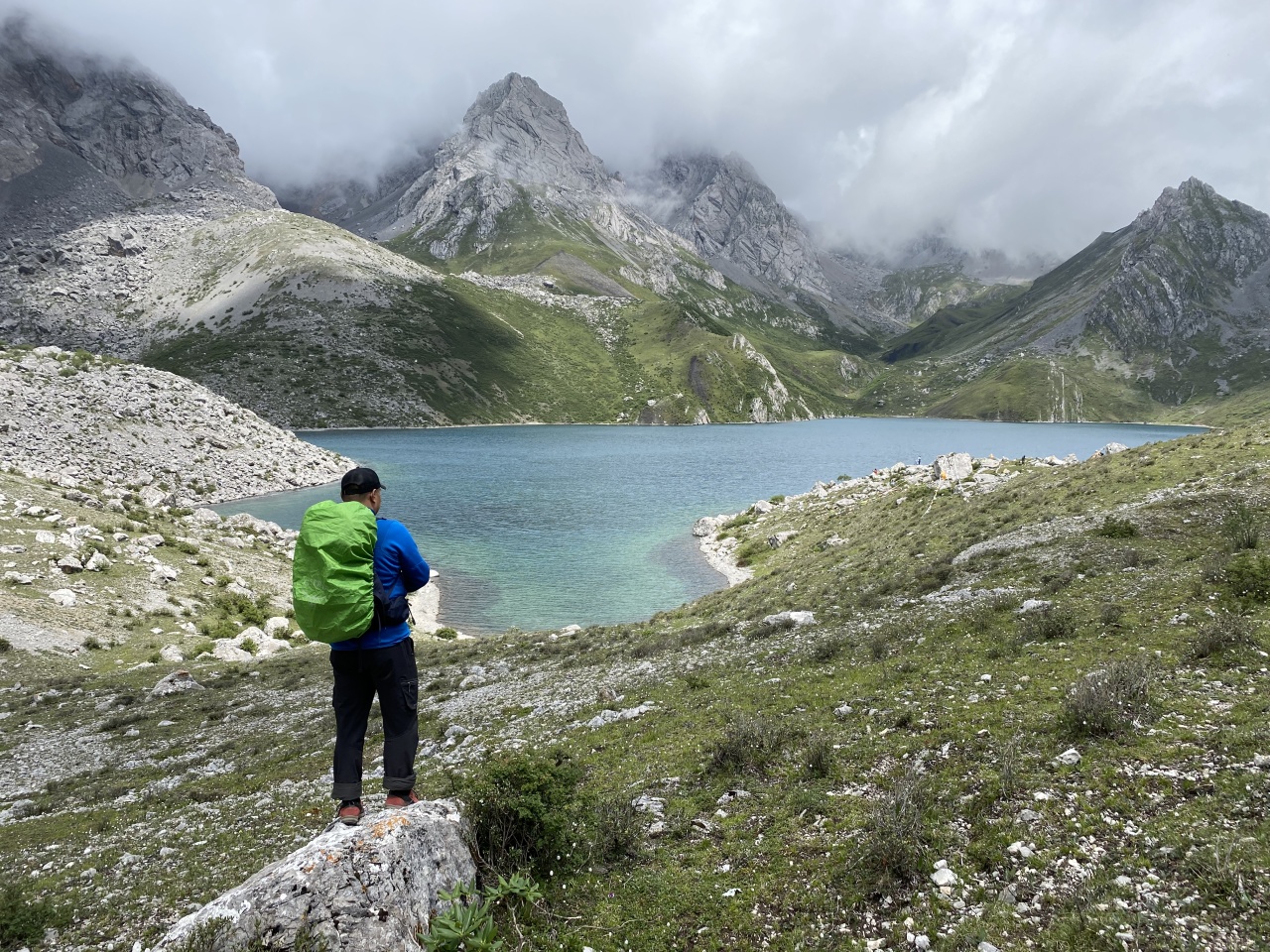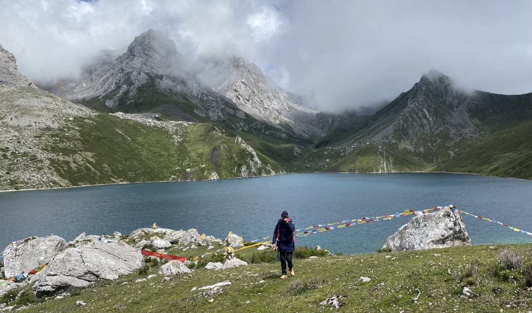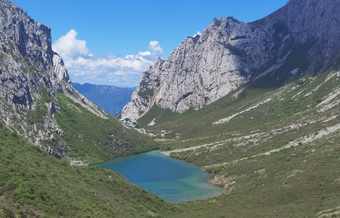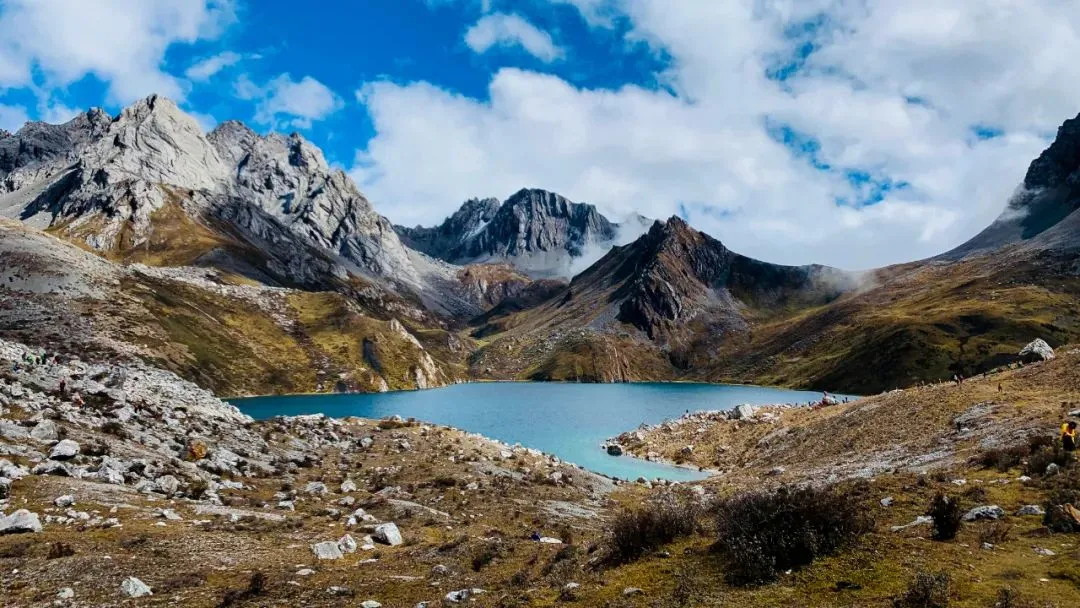 行程概览:早餐之后,我们开始今天的徒步之旅,往上走约2km到达红星海,红星海海拔约3900M,四周山石堆积,山峰耸峙,湖面宽大平静,湖水湛蓝,一种震撼的感觉扑面而来;继续往走,到达红星海垭口,随后开始一个坡度约45度,垂直高度约400M的下坡,一路往下到达一处干枯的湖泊,长满了茂密的草,一到雨季,偶尔要也会从里面渗出水来,故名“草海子”穿过一处平整的山坳,稀松的森林,陡峭的山坡,到达鱼海子,鱼海是一处溪水淤积而成的沼泽湖泊,主要以水草为主,由于此处水草丰茂,溪水又穿插其中,所以此处有“岷江寒水鱼”生长,最后到达琅琊沟营地进行露营。
