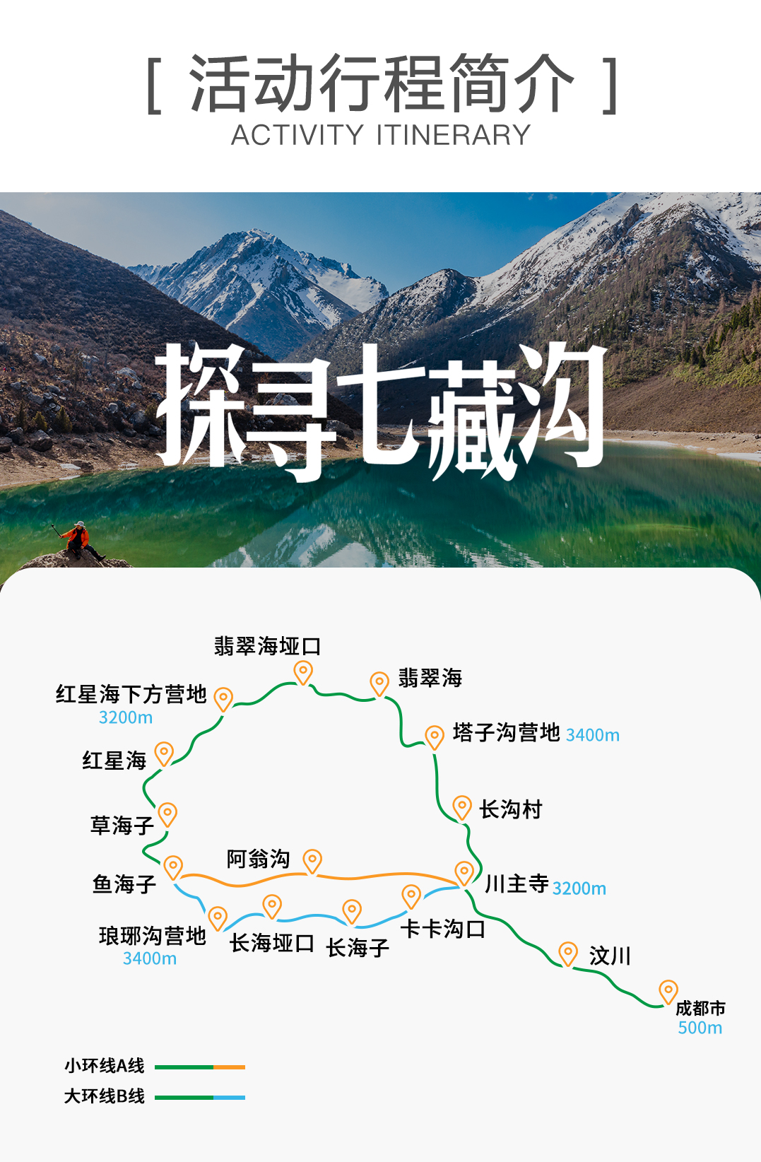 红星海下营地-(徒步约2KM)-红星海-(徒步约4KM)-草海子-(徒步约4KM)-鱼海子-(徒步约8km)阿翁沟-(乘车约30km)川主寺