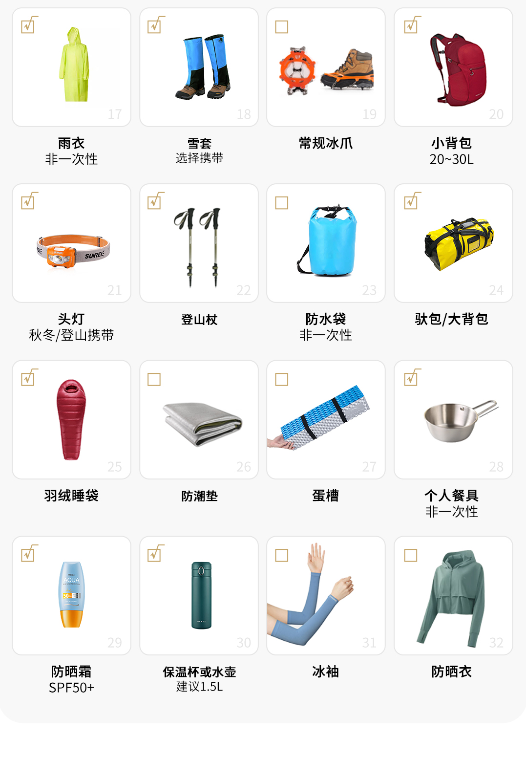 7.装备:①提供帐篷、防潮垫;②燃料、炉具、炊具、部分餐具、通讯工具等。