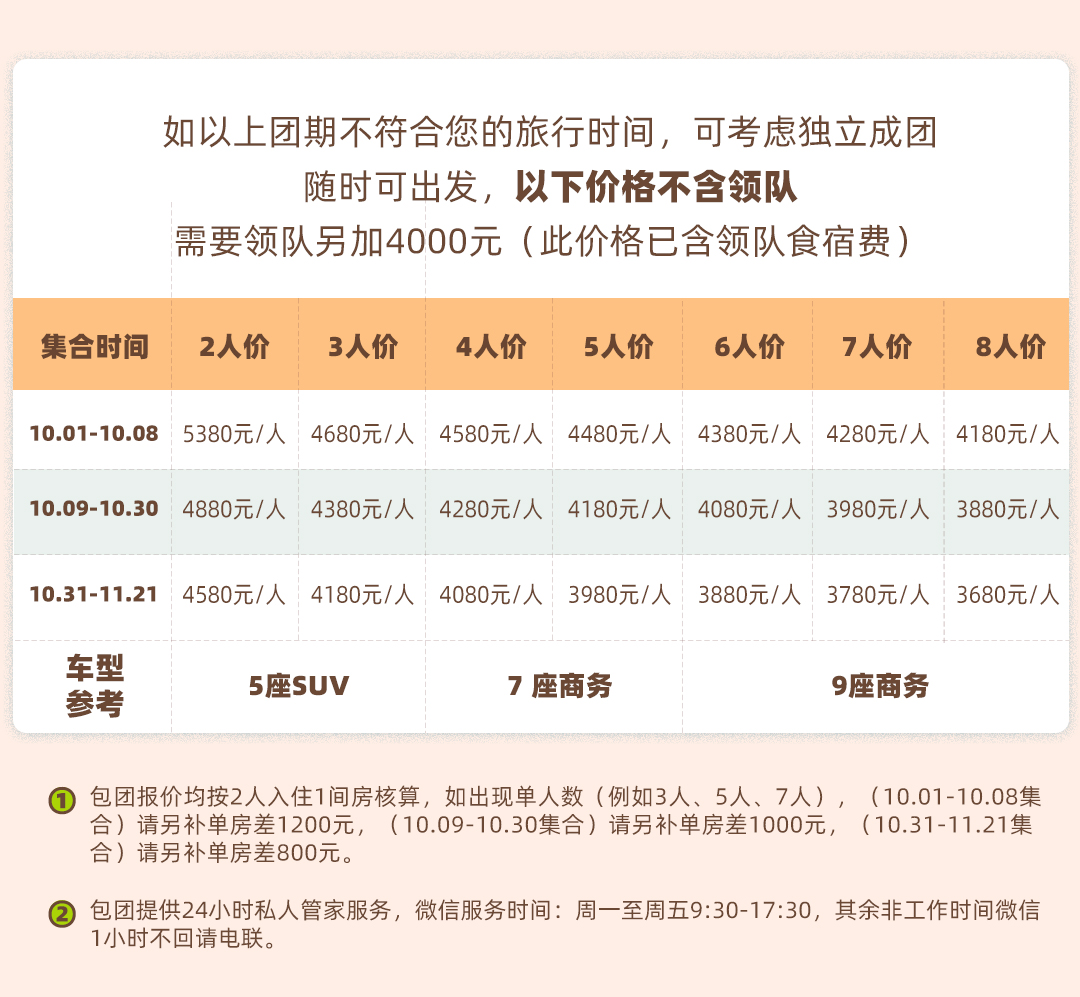 【成团说明】1人成行,1-5人司机兼向导,6人及以上配纯玩领队,15人即升级摄影师+领队双人服务,28人封队;