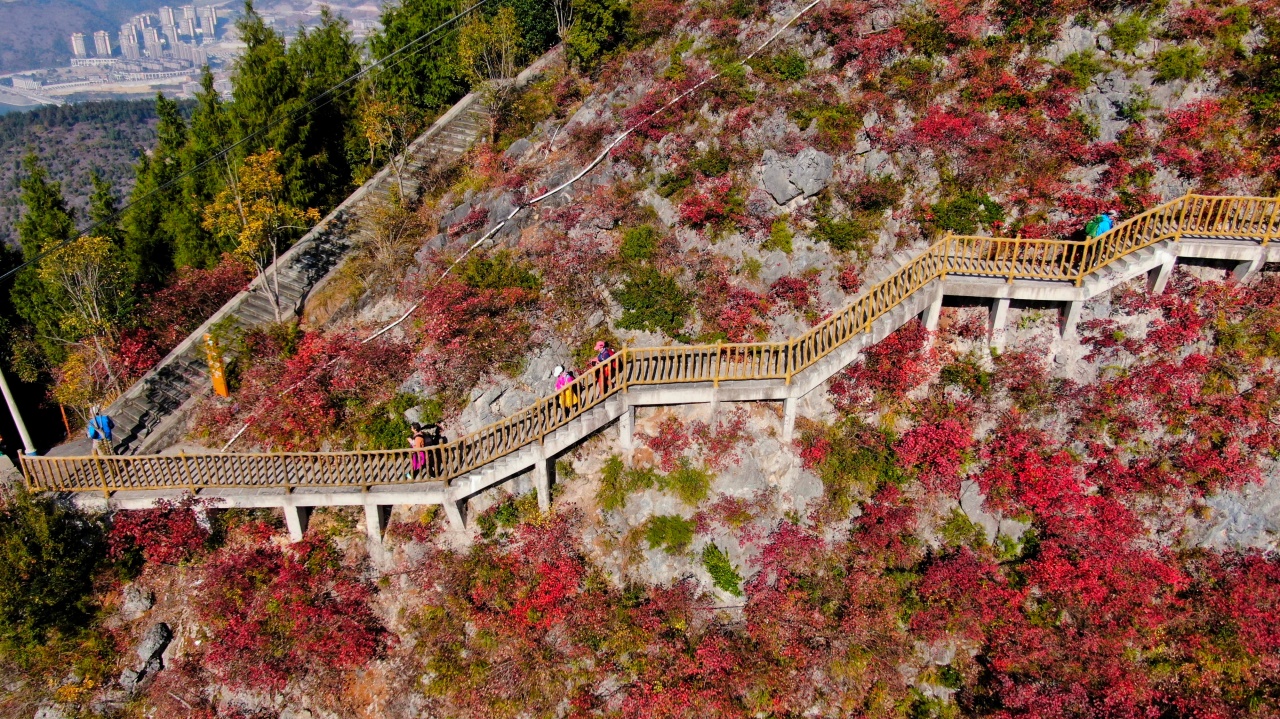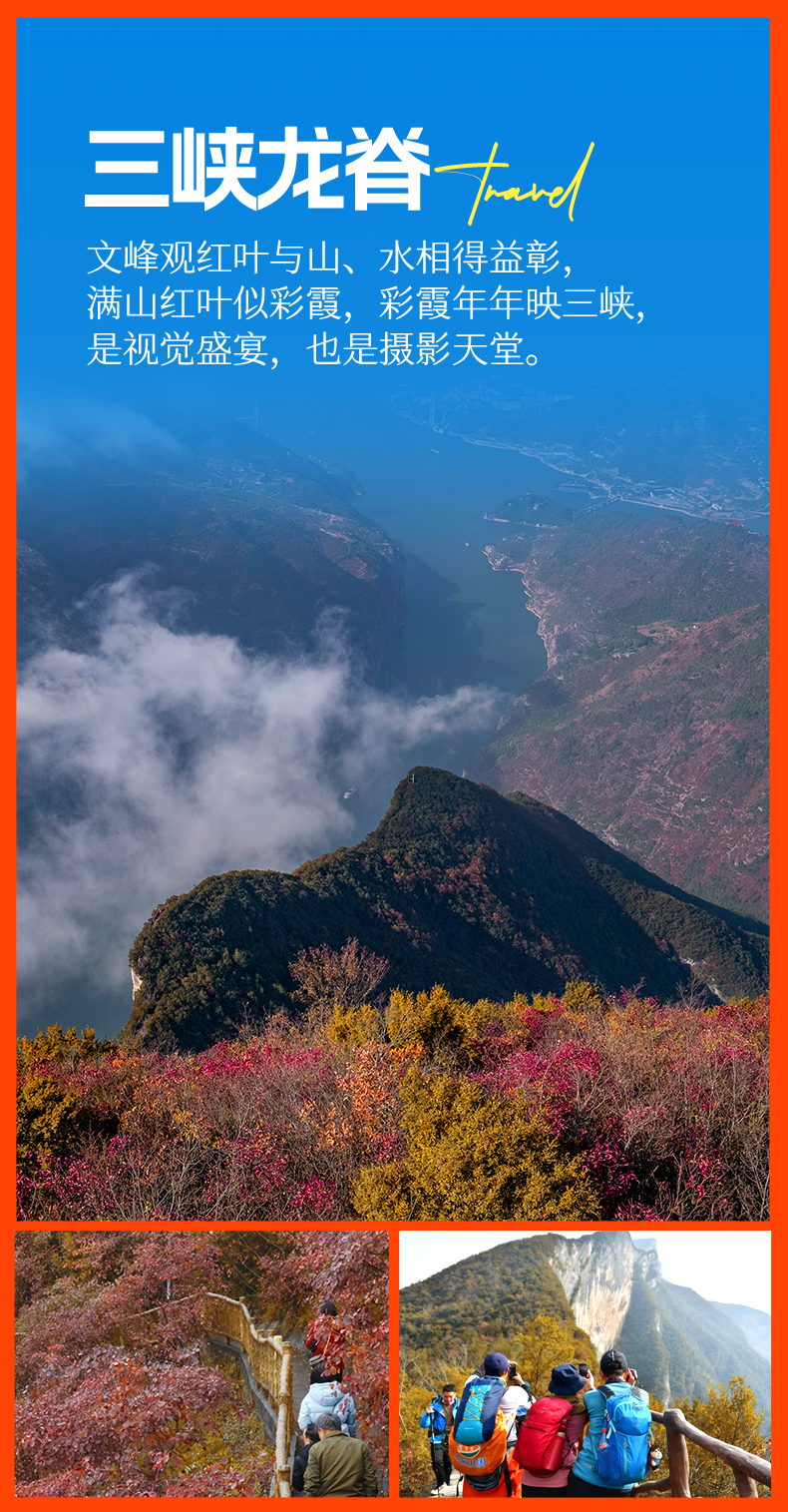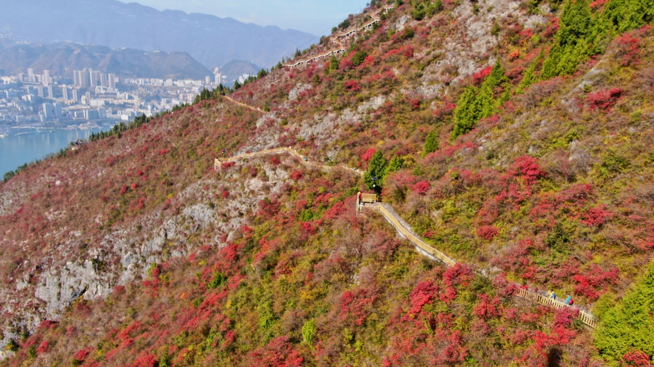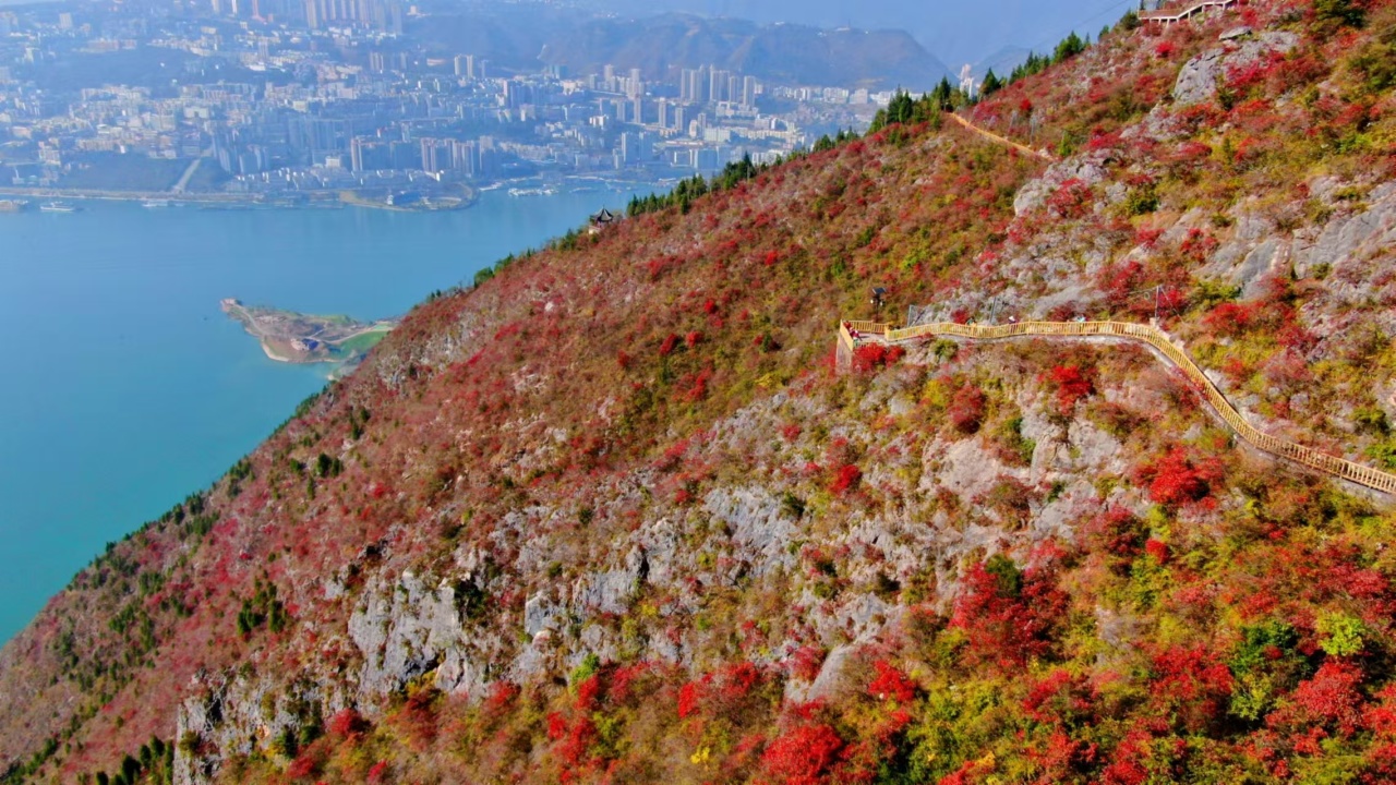 站在文峰观山顶远眺,红叶遍山峦,长江如带、柔润绵长,一江碧水与江山红叶交相辉映,蔚为壮观。透过似火的红叶,俯瞰巫峡口彩虹卧波,“一桥飞架南北,天堑变通途”。远眺巫山县城依山层叠,江与城风情如画,让人顿生江山豪情。