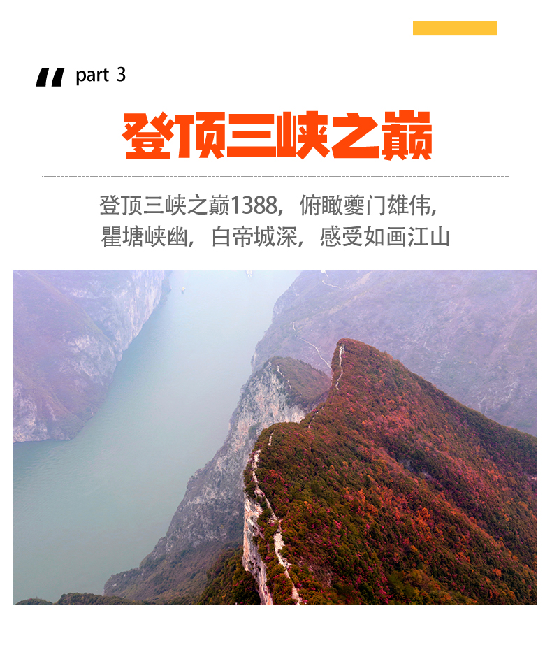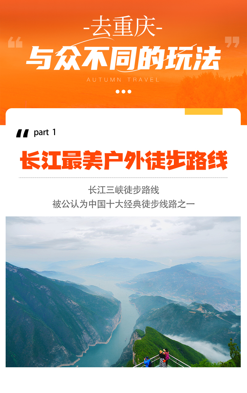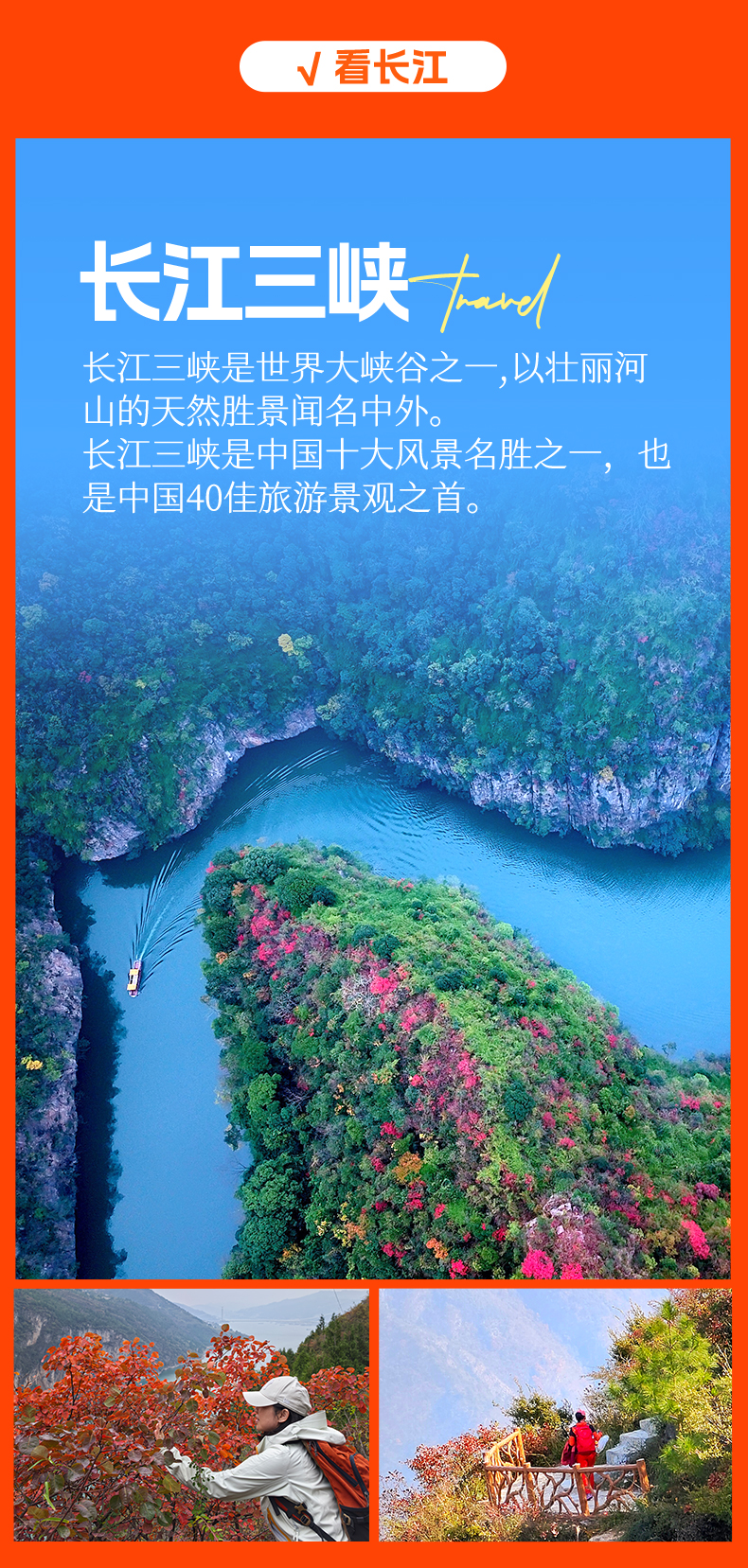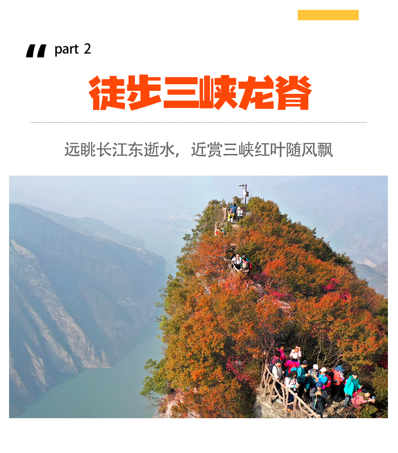 徒步长江三峡是中国十大经典徒步线路之一,属于入门级徒步线路,老少皆宜。徒步过程中可以体验到从峡谷深处到山顶的垂直变化,同时欣赏到长江的雄伟以及秋季红叶的绚丽景色。