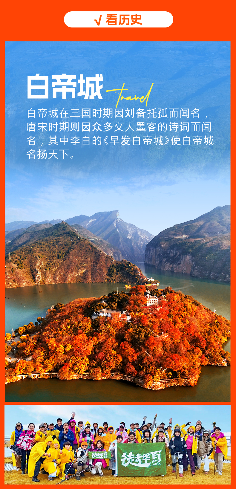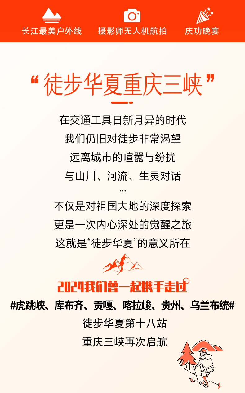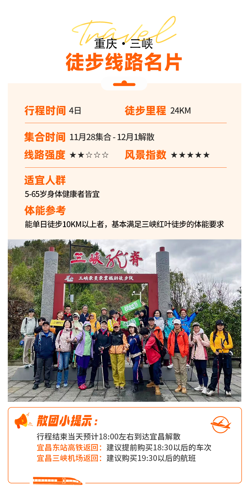 徒步长江三峡是中国十大经典徒步线路之一,属于入门级徒步线路,老少皆宜。徒步过程中可以体验到从峡谷深处到山顶的垂直变化,同时欣赏到长江的雄伟以及秋季红叶的绚丽景色。