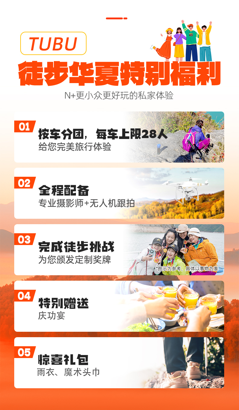 本产品以徒步旅行为主,适用于8-65岁身体健康人士