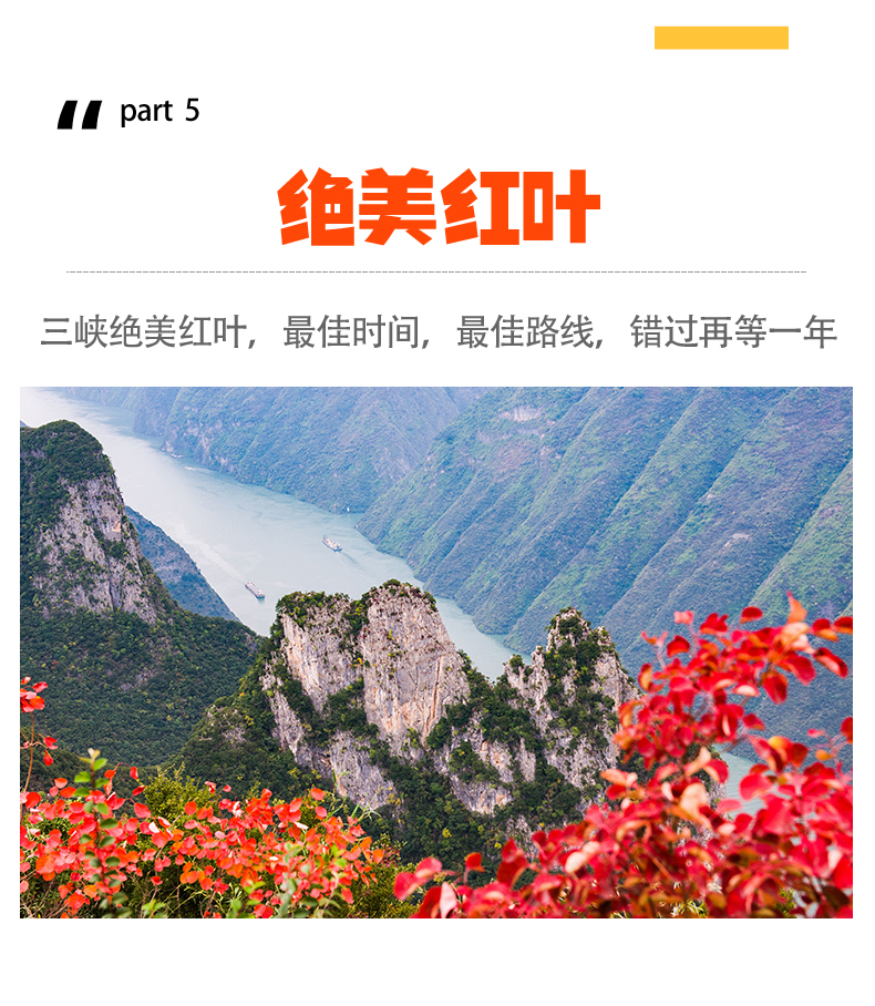 神女天路是一段风景绝佳的红叶路线,在如火如荼的红叶里穿梭,近距离接触红叶。一路穿越巫峡,欣赏“曾经沧海难为水,除却巫山不是云”的壮观景象,一路红叶相伴,美不胜收,这里也被驴友评为长江上最美的三峡画廊。