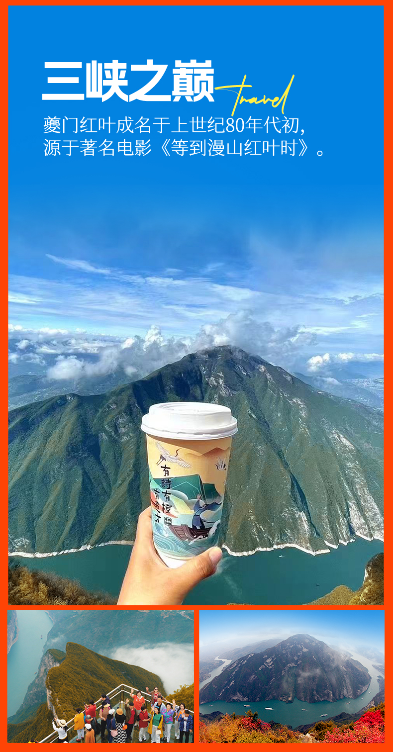 三峡之巅风景区,因杜甫“赤甲白盐俱刺天,闾阎缭绕接山巅。枫林橘树丹青合,复道重楼锦绣悬”的诗句而得名,是长江三峡物理形态的最高处,景观形态的最美处。站在三峡之巅俯瞰长江的壮美和那满山的红叶。时间碰巧的话,在三峡之巅还有个人的音律表演。