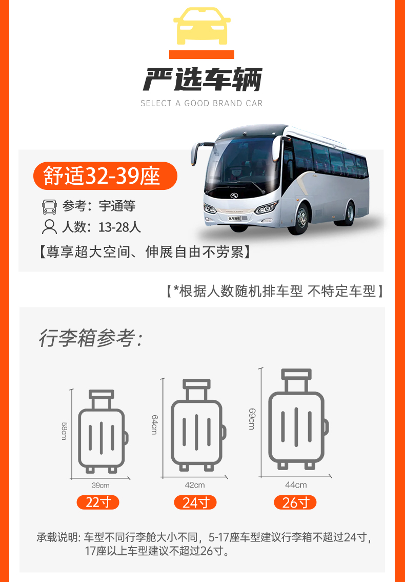 1、交通:行程中旅游包车费用,油、路、桥费,11-38座用车,保证一人一正座;