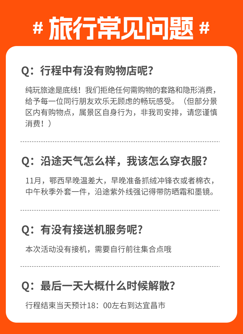 1、行程结束当天预计18:00点左右抵达宜昌解散。