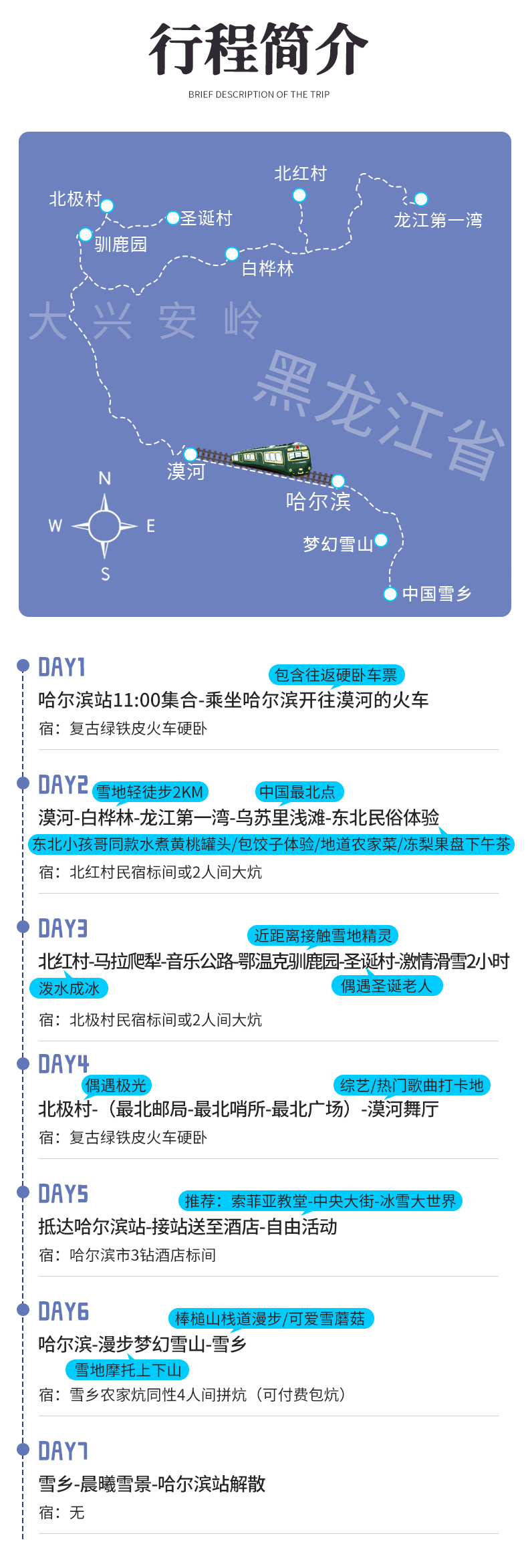 4、不含接送机,如需安排请最少提前2日和客服联系,哈尔滨接送机包车5座轿车150元/趟,夜航190元;7座商务车240元/趟,夜航290元/趟;夜航时间为21:00及以后-次日07:00及之前落地或起飞的航班,春节团期+50元/台车,包车费用以太平机场前往哈尔滨主城区定价(南岗区、道里区、道外区),如需包车前往其他区域请联系客服现询价,接送机春节价格请现询。