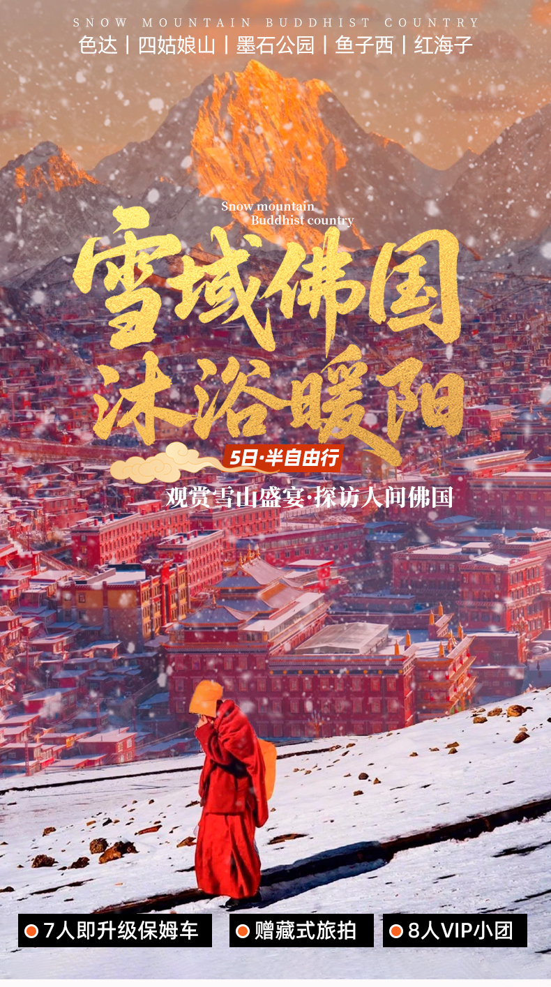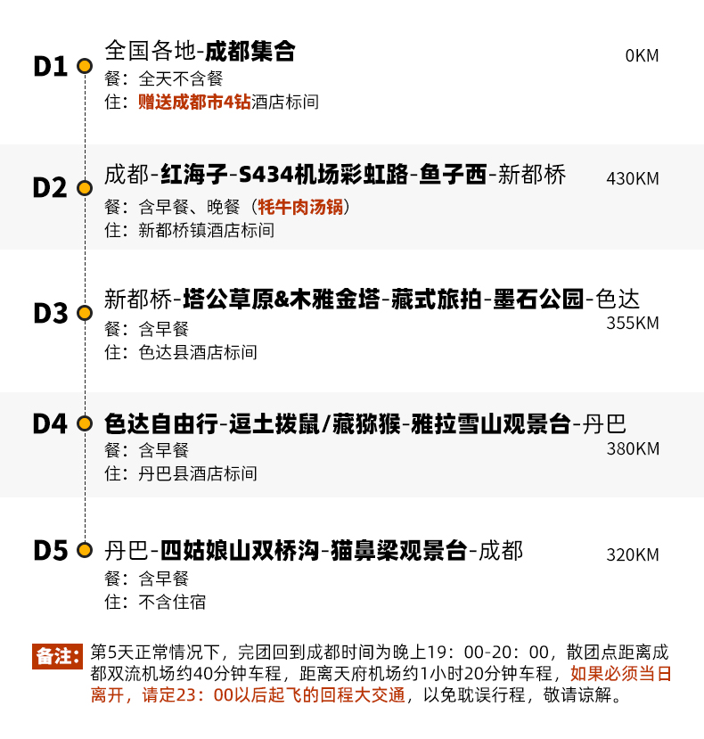 4、景交:四姑娘山双桥沟观光车70元/人(必须);墨石公园观光车20元/人(必须);红海子清洁费30元/人(可选);鱼子西清洁费30元/人(必须);色达乘车票48元/人,报名后请根据自己的游玩日期自行预约;