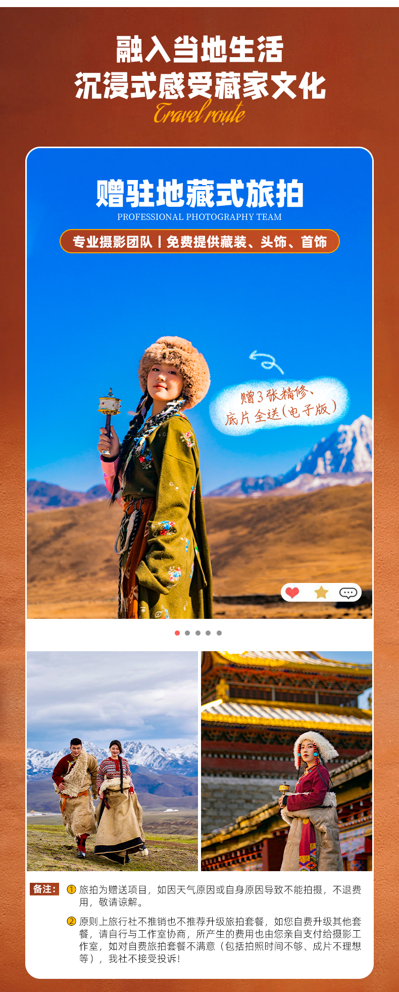 1、驻地藏式旅拍1次(免费提供藏装/首饰,赠3张电子版简修,底片全送);