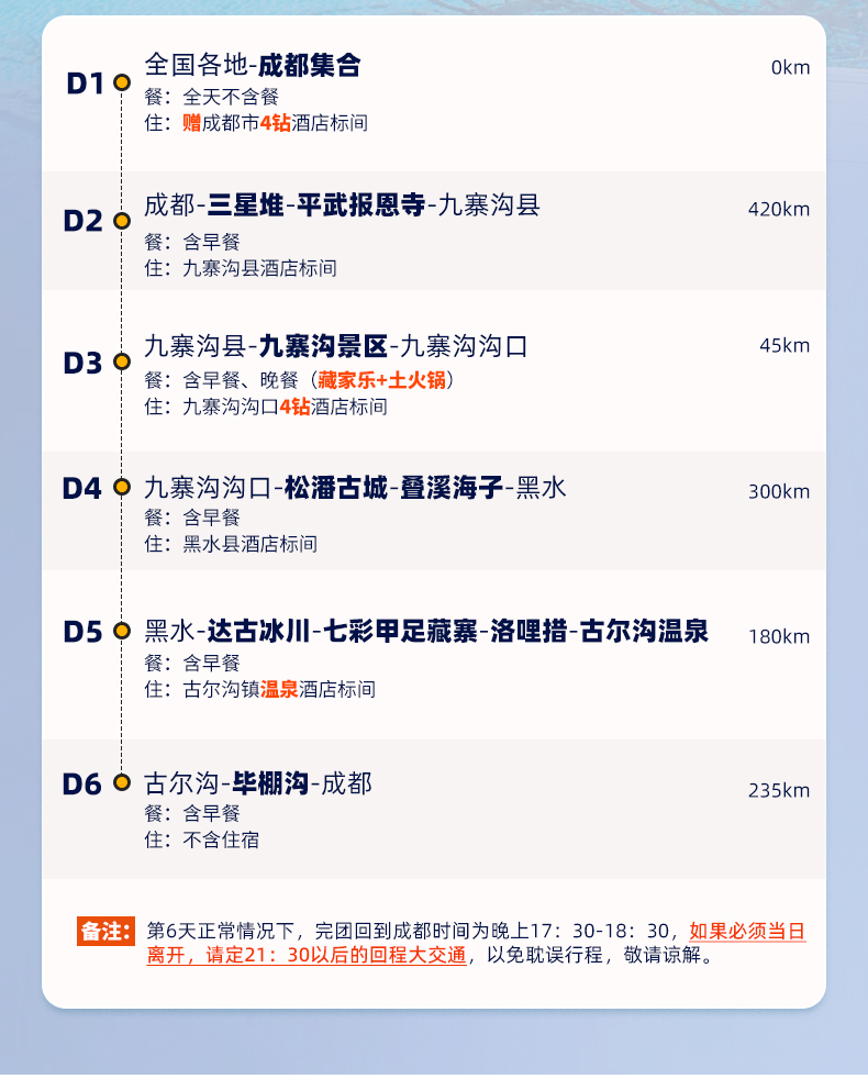 注:接机/站请提前2天告知航班号/车次,否则视为放弃此服务;赠送项目如客人自愿放弃或因特殊原因及不可抗力等原因无法参加,均不退费用,也不等价交换。