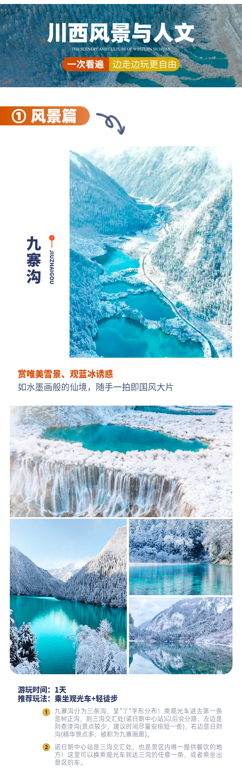 4、景交:九寨沟观光车淡季80元/人、旺季90元/人(必须)、达古冰川观光车70元/人(必须)+往返索道180元/人(必须)、毕棚沟观光车70元/人(必须)+电瓶车20-30元/人(分段计费、可选);