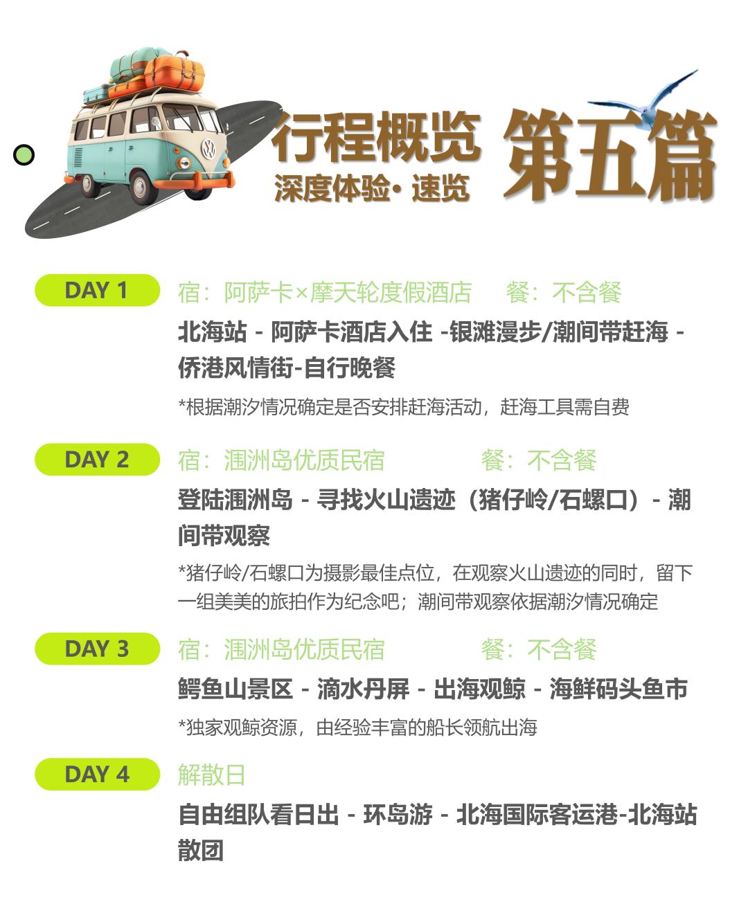 1.涠洲岛经常受大风影响导致停航,出发前2天如接到通知不能上岛,报名团费全部退回,不作赔偿,敬请理解!